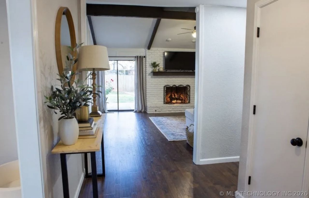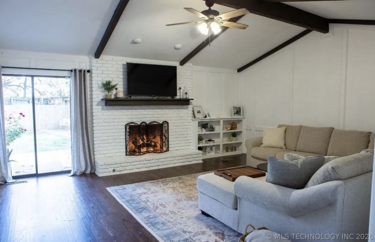 Welcome to this beautifully maintained home located in a quiet neighborhood within highly sought-after Bixby School District. From the moment you step inside, you'll appreciate the many modern finishes and upgrades with durable vinyl wood plank flooring throughout the house as well as newer light fixtures and ceiling fans. Spacious living room features vaulted ceilings and a focal-point floor-to-ceiling brick fireplace. Kitchen is designed for everyday living and entertaining, featuring all stainless appliances, including a double oven and a newer over the range microwave with lighting and venting. Kitchen also has white quartz countertops, newer crown molding and LED recessed lighting. You will enjoy the cozy dining nook perfect for casual meals or morning coffee. The home offers a formal dining area, ideal for hosting, gatherings or dinner parties which could be a second living area as your needs dictate. The spacious primary suite serves as a private retreat, complete with a stunning walk-in white marble tile shower with both standard and overhead rainfall showerheads. You will love the large-format white marble flooring and matching quartz countertops. Large bedroom with walk-in closet and additional flex space for a home office, nursery, reading nook, or workout area. Outdoors, massive 40-year old oak trees create a serene park like atmosphere. The backyard features a firepit, pea gravel lounge area, mature landscaping and full privacy fence, creating a serene space perfect for relaxing evenings, playtime, or weekend gatherings. New roof installed 2026. Solar panels available if buyer wants to have them installed. ADT security hardware with exterior cameras included. Non-HOA neighborhood with easy access to highways as well as the south Memorial shopping and dining. This home offers the perfect blend of quiet neighborhood living and everyday convenience.