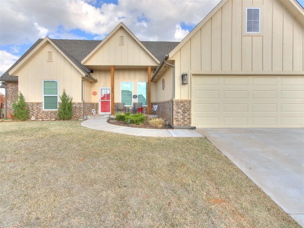 Custom Build Home! 3-bedroom, plus an office, 2 bathroom home with 1,888 sq. ft. combines modern style & functionality. A dedicated office/flex room offers great opportunity of use. Open-concept floor plan featuring a chef's kitchen with granite countertops, stainless steel appliances, a large center island, walk-in pantry, and gas or electric stove for cooking. The primary suite offers a private retreat with a freestanding soaking tub, walk-in shower, dual vanities, and an oversized walk-in closet. Secondary bedrooms are spacious with excellent closet storage. Designed with comfort and peace of mind, this home includes ceiling fans throughout, a mudroom/drop zone, oversized doors, full gutters, a built in hardwired security system, and an above-ground storm shelter/safe room in the garage. Enjoy outdoor living on the covered front porch or spacious back patio with a gas hookup for grilling plus a home generator! The gated community features a stocked fishing pond for residents only, perfect for relaxing weekends close to home. Located just minutes from I-40 or the turnpike, Yukon shopping, dining, parks, and top-rated schools. HOA takes care of front and back lawn maintenance, offering a low-maintenance lifestyle in a well-kept neighborhood. This home truly has it all-modern finishes, thoughtful upgrades, a fantastic layout, and a prime location in Yukon schools!