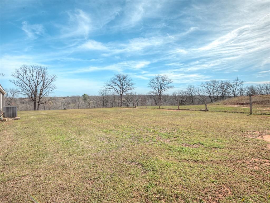 What a View! Nestled on a sprawling 10-acre hilltop in Norman, this property is defined by its remarkable elevation and the far-reaching views. The land rolls out from the house in a series of open grassy fields and wooded patches, offering a rare sense of scale and a vantage point that lets you see for miles. The entire 10.02-acre perimeter is fully fenced for livestock, with a separate fenced area immediately around the home for pets and gardening - keeping the pond and pastures accessible but separate. A large wooden front deck offers the perfect spot to sit and take it all in.There is also a 36x36 dirt floor barn with multiple stalls for animals or equipment storage. The interior of the 2,128-square-foot home is designed with a practical, split-bedroom floor plan that emphasizes open space. Stepping inside, the entry flows into a dining area highlighted by an antler chandelier, which transitions naturally into a second living area off the dining room. The main living areais completely open to the kitchen and features vaulted ceilings with decorative wood beams and a freestanding wood-burning stove set on a tiled hearth. Laminate wood flooring runs through these main areas, leading into a spacious kitchen centered around a large island. Light oak cabinetry and a stainless steel five-burner gas range provide plenty of utility for daily life.The master suite is situated privately on one side of the home, featuring a large bedroom with multiple windows and a walk-in closet with custom wooden shelving. The ensuite bathroom is equipped with a double vanity, a corner soaking tub under a skylight, and a separate walk-in shower. On the opposite side of the house, the secondary bedrooms are finished with neutral carpeting and natural wood trim, sharing a second full bathroom. A dedicated mudroom and laundry area near the rear exit adds extra storage and serves as a transition point to help keep the rural part outside. You won't want to miss this opportunity!