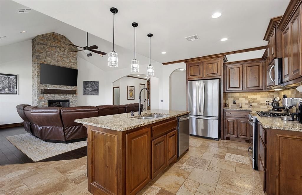 Introducing your dream home! This stunning property boasts a spacious 3-bedroom layout plus a dedicated office, perfect for modern living. With two and a half bathrooms, including a luxurious master bath featuring double vanities, a whirlpool tub, and a walk-in shower, comfort and convenience abound. The secondary bedrooms share a jack-n-jill bath. Situated on a vast 1.84-acre corner lot, this gem backs up to a serene neighborhood pond, offering breathtaking views. The property also includes a generous 3-car garage and a 30x40 insulated shop equipped with electricity, ideal for hobbies or storage. You'll never have to worry about power outages with a home generator in place. The open kitchen is a chef's delight, featuring updated stainless-steel appliances, a large pantry, and elegant travertine flooring. The living room impresses with soaring 17-foot ceilings and beautiful stained wood elements throughout. Designed for leisure, this home also features a huge master closet connected to the laundry room for added ease. Enjoy the luxury of new upgrades, including a roof with top-grade shingles and Pella windows, both installed in 2024, along with a new water heater in 2026 and a sprinkler system installed for easy lawn care. Relax and entertain with a small saltwater pool that can be heated or used as a splash pad, complemented by an outdoor kitchen and firepit, making it perfect for gatherings. Additionally, the property has a storm shelter for safety and peace of mind. Don't miss this entertainer's dream home with a spectacular view and countless features that elevate everyday living!